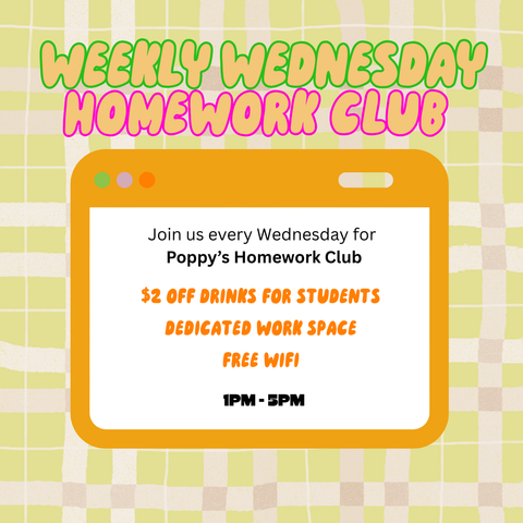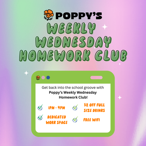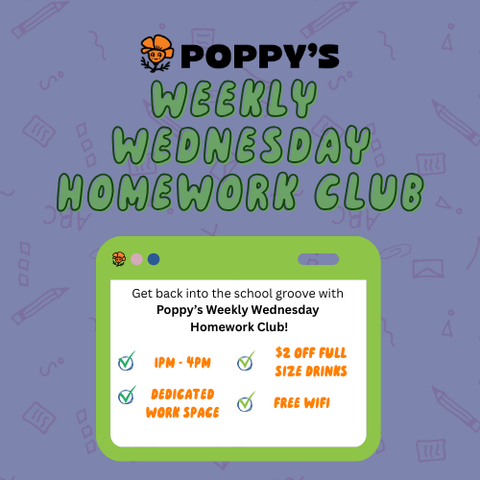 Looking for the cafe that's open until 5pm daily with coffee, tea, boba and kid friendly drinks? We got you covered! Poppy's Cafe is open daily from 10am - 5pm. Pop in and get your fix!