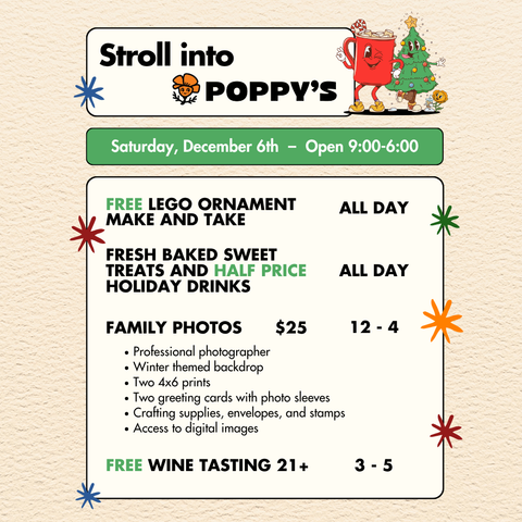 At Poppy's, we are hyper-focused on bringing together families - no plans needed. That's why we have a unique play zone for you and your family to test drive toys, meet other families and just hang.